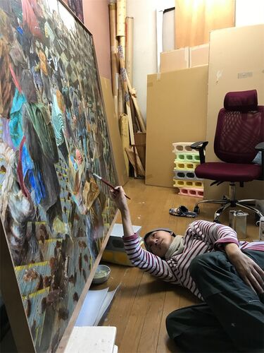 ↑これは、作者が具合悪いのを圧して横たわったまま根性で絵を描いているところではありません。下から仰ぎ見て、光の照り返しを頼りに、仕上げワニス(varnish 保護ワニス)を薄くムラなくまんべんなく塗布しているところです。撮影は、作品の移動のために手…