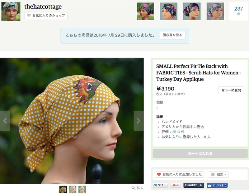 いずれも海外のハンドメイド作品を売るサイトEtsy(https://www.etsy.com/jp/)に出品されてたもので、円高のため送料(1500円くらい)込みでも安い!最近は日本語にも対応してきています。違う作家さんですが、どちらも縫製はキチンとしていて、布の肌触りも良いです。上の商品の布地は伸縮性があって、襟足のカバー具合では下の商品よりも優れてます。何より一見して医療帽ぽくないし、スマートでクールなデザインで、気に入ってます。後頭部に膨らみのあるデザインの方が、医療帽ぽく見えないかもしれません。